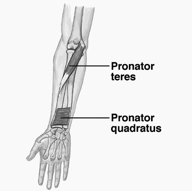 經過評估過後,發現他右手的橈骨(左上圖#1)以及尺骨(左上圖#2)有些微的異位,而造成異位的原因是因為旋前圓肌(左下圖上)以及旋前方肌(左下圖下)過於緊繃,可能是在某一次的擊球過程中用力過猛或突然的外力受傷所致。治療時首先矯正骨骼(例如下圖示,透過訓練控制橈骨與尺骨位置的旋前肌、旋後肌肌力),再做肌筋膜的放鬆,經過三、四次的治療後終於痊癒,也可以繼續打球,他因此常介紹球友來治療。